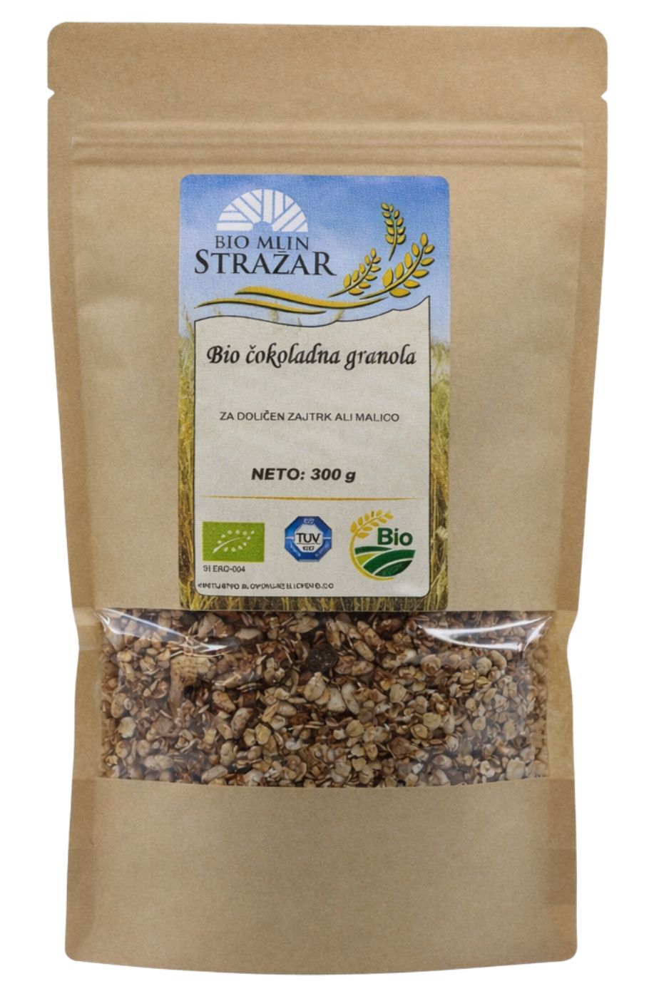 Bio čokoladna granola je skupek ekoloških sestavin odličnega okusa, za popoln začetek vašega dneva. Glavna sestavina so mehki ovseni kosmiči. Dobra popestritev je tudi za tiste, ki ne uživajo mleka. Granola je pečena v pečici.
