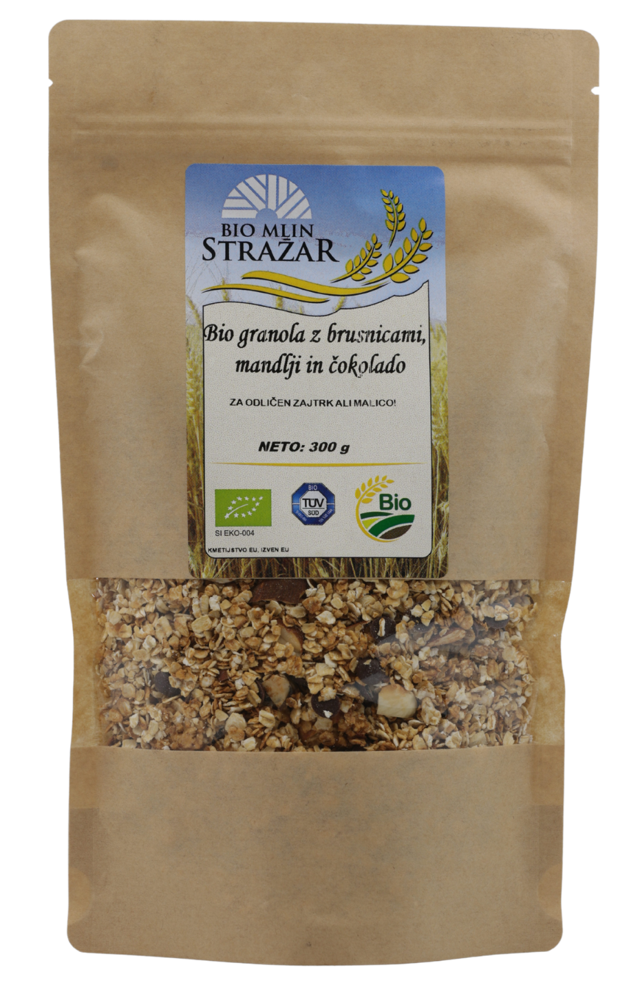 Bio granola z mandlji brusnicami in čokoladnimi kapljicami je skupek ekoloških sestavin odličnega okusa, za popoln začetek vašega dneva. Glavna sestavina so mehki ovseni kosmiči. Dobra popestritev je tudi za tiste, ki ne uživajo mleka. Granola je pečena v pečici.