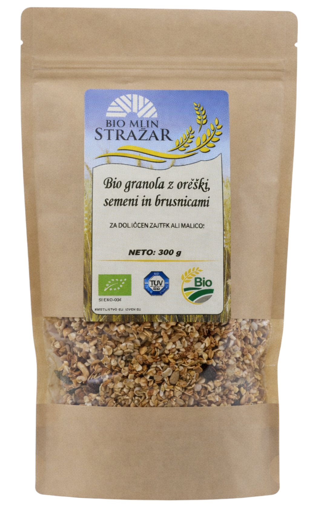 Bio granola z oreščki semeni in brusnicami je skupek ekoloških sestavin odličnega okusa, za popoln začetek vašega dneva. Glavna sestavina so mehki ovseni kosmiči. Dobra popestritev jedilnika je tudi za vegane. Granola je pečena v pečici.