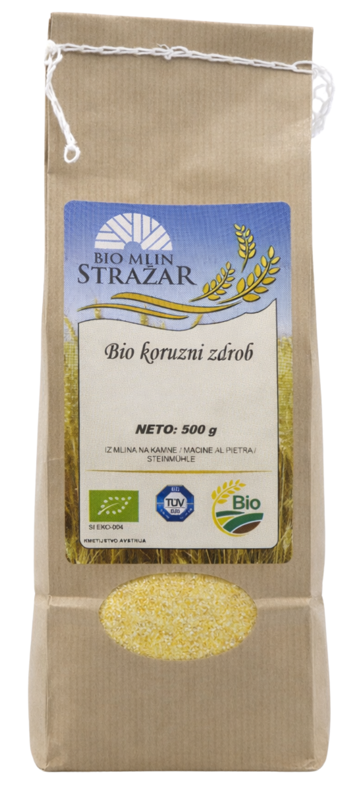 Bio koruzni zdrob, iz stare sorte koruze – Trdinke se uporablja za pripravo polente, za zgoščevanje juh, kot dodatek peki peciva…