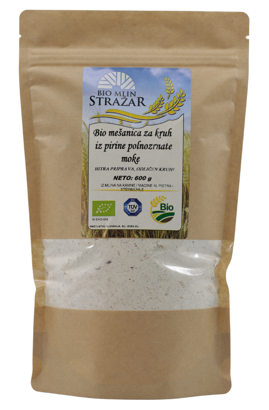 Bio mešanica za kruh iz pirine polnozrnate moke je priročna osnova za pripravo domačega kruha. Vsebuje skrbno izbrane sestavine: bio pirino polnozrnato moko, bio lanena semena, bio sončnična semena, bio bučno seme in bio pecilni prašek iz vinskega kamna ter sol. Kruh ima poln, rahlo oreščkast okus ter bogato teksturo. Primerna je za hitro in enostavno peko domačega kruha.