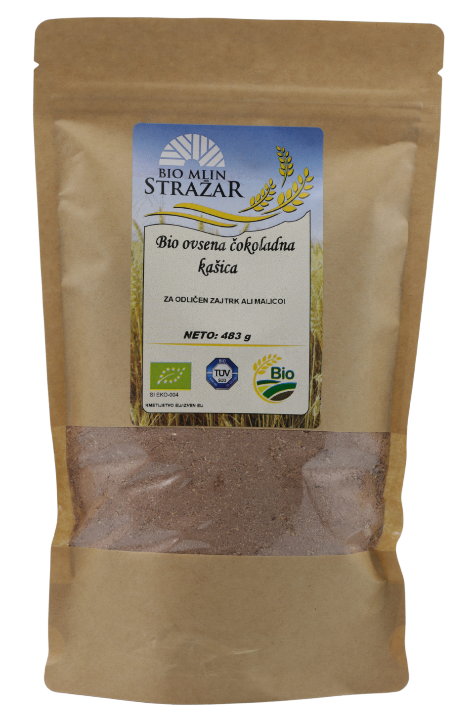 Sestavine: bio ovsena moka (zmleti ovseni kosmiči), bio kakav v prahu, bio trsni sladkor.